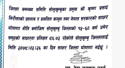 केदार बस्नेत।सोलुखुम्बुलाई साक्षर जिल्ला घोषणा गरिएको छ । साक्षर नेपाल, समृद्धिको आधार, साक्षर सोलुखुम्बु हाम्रो गौरव, हामी सबैको प्रणः सार्बजनिक शिक्षा प्रणालीको सबलिकरण भन्ने नाराका साथ साक्षरता जिल्ला घोषणा गरिएको हो।