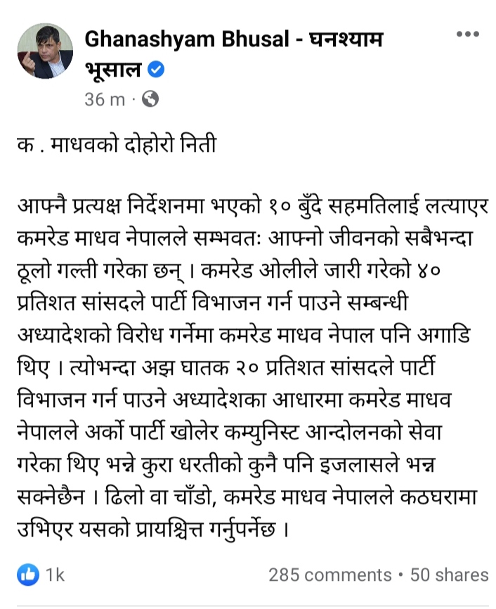 आफ्नै प्रत्यक्ष निर्देशनमा भएको १० बुँदे सहमतिलाई लत्याएर माधवले सम्भवतः आफ्नो जीवनको सबैभन्दा ठूलो गल्ती गरेको उल्लेख गर्दै सामाजिक सञ्जाल फेसबुक पेजमा भुसालले लेखेका छन,-‘२० प्रतिशत सांसदले पार्टी विभाजन गर्न पाउने अध्यादेशका आधारमा माधव नेपालले अर्को पार्टी खोलेर कम्युनिस्ट आन्दोलनको सेवा गरेका थिए भन्ने कुरा धरतीको कुनै पनि इजलासले भन्न सक्ने छैन।’