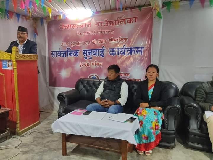 सोलुखुम्बु। सोलुखुम्बुको नेचासल्यान गाउँपालिकाले चौमासिकको सार्वजनिक सुनुवाई गर्दै अहिलेसम्मका प्रगति बिबिवरण समेत सार्बजनिक गरेको छ।
