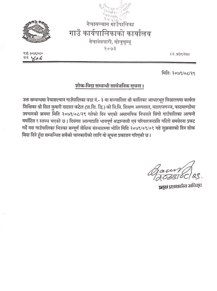 सोलुखुम्बु।नेचासल्याउन गाउँपालिकाले भोलि (शुक्रवार) शोक बिदा दिने भएको छ।