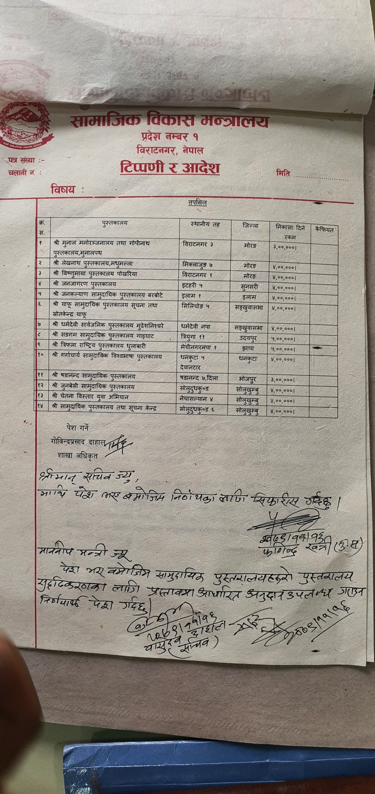 यसैबीच,सामाजिक विकास मन्त्रालयले सामुदायिक पुस्तकालयको पुस्तकालय सुदृढिकरणका लागि बजेट बिनियोजन गरेको छ । आज सामाजिक विकास मन्त्री बुद्धिकुमार राजभण्डारीको उपस्थितीमा प्रदेश १ का बिभिन्न १४ वटा पुस्तकालयका लागि आवश्यक्ताका आधारमा बजेट बिनियोजन गरिएको हो ।