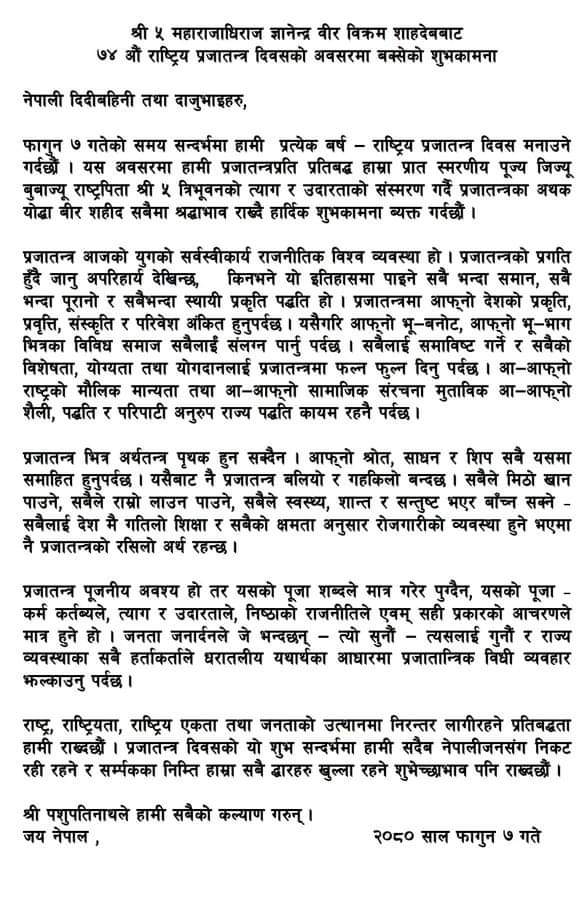७४ औँ प्रजातन्त्र दिवसको पूर्बसन्ध्यामा शुभकामना सन्देश जारी गर्दै पूर्वराजा शाहले प्रजातन्त्रमा सबैले खान लाउन पाउने, स्वस्थ र सन्तुष्ट भएर बाँच्न पाउने अवस्था हुनुपर्ने बताउनुभएको हो।