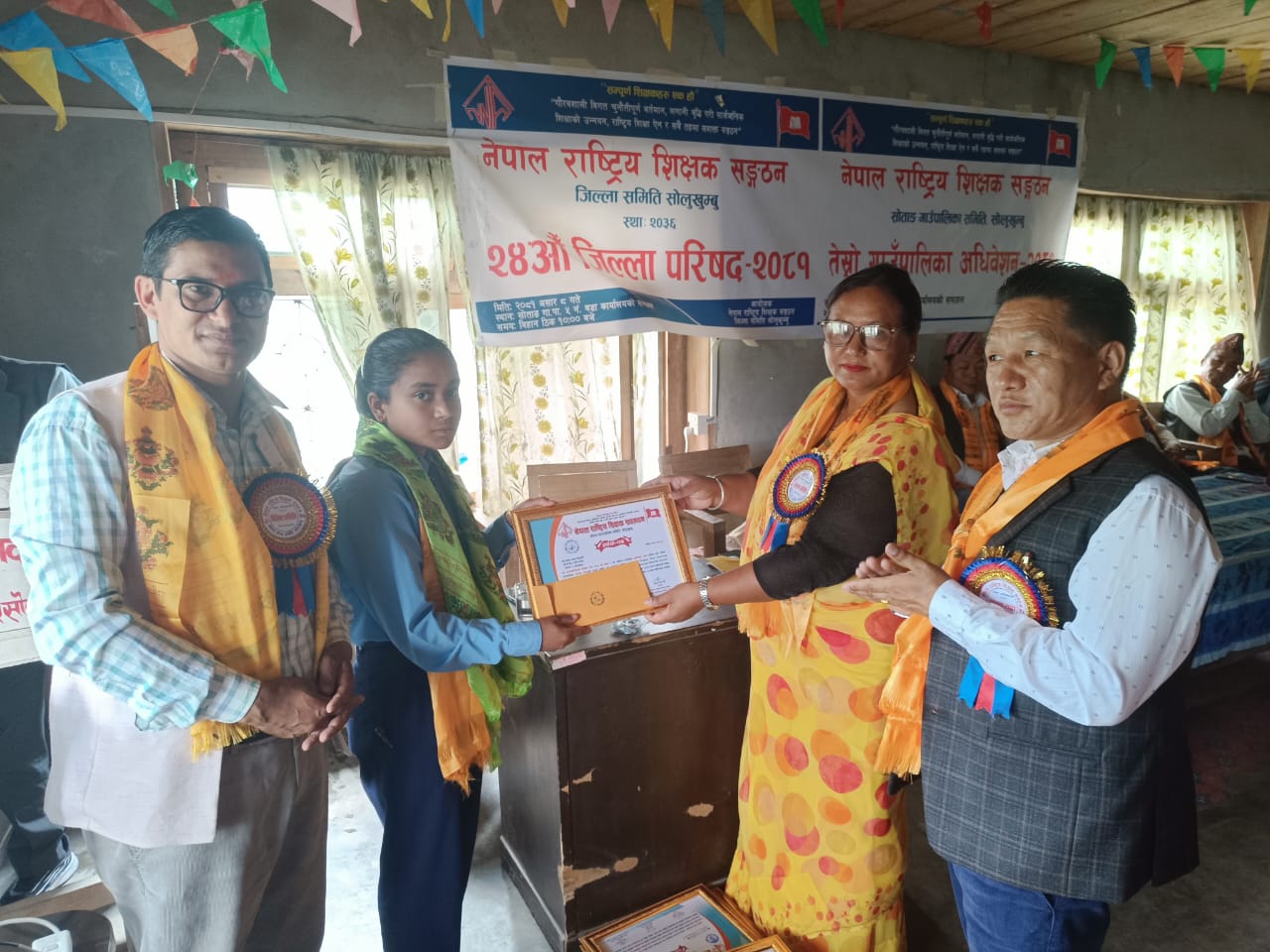 संगठनका गाउँपालिका अध्यक्ष लालकुबीर राइको अध्यक्षतामा सम्पन्न कार्यक्रममा स्थायी सेवामा नव प्रबेशी ८ जना शिक्षक झमक बाबु बस्नेत,धनकुमारी राई,डोमालक्ष्मी राई,बसन पाखिन,भाइकाजी बस्नेत,सानुमाया कुलुङ,निलम कुलुङ र गोविन्द कोइराला तथा पालिका भित्रका ७ वटा विद्यालयका प्रधानाध्यापकहरु क्रमशः हुलु माबिका टंक दाहाल,सोताङ आविका सबिना कुलुङ,मदन आश्रीत आबिका हरि बहादुर बस्नेत,हुगा माबिका झनक बस्नेत,तोस्खम आविका गिता गुरुङ लगायतलाई सम्मानित गरिएको थियो।यसैगरी, अनिबार्य अवकाश प्राप्त शिक्षक लक्ष्मण साह,प्राबि तृतीयबाट बढुवा हुने शिक्षक छत्र थापालाई सम्मानित गरिनुका साथै पालिका उत्कृष्ट बिद्यार्थी बीरेन्द्र ज्योति माबिमा अध्ययनरत छात्र रोमन बस्नेत र छात्रा अर्पण ठटाललाई सम्मान स्वरुप ५ हजार नगद सहित पुरस्कृत गरिएको सो संगठनले जनाएको छ।