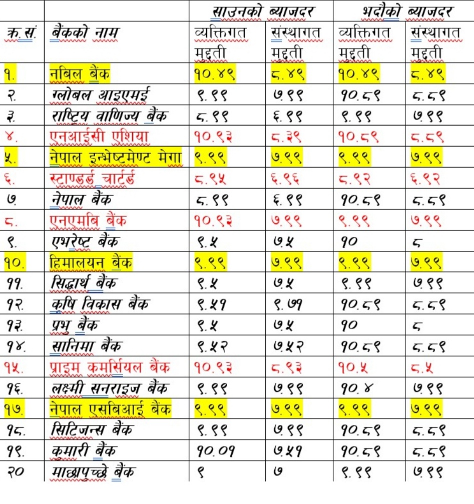 यस्तै, प्राइम बैंकको संस्थागततर्फ ८.५ प्रतिशत र ब्यक्तिगततर्फ १०।५ प्रतिशत, नबिल बैंकको संस्थागततर्फ ८.४९ प्रतिशत र ब्यक्तिगततर्फ १०.४९ प्रतिशत, लक्ष्मी सनराइज बैंकको संस्थागततर्फ ७.९९ प्रतिशत र ब्यक्तिगततर्फ १०.४ प्रतिशत र प्रभु बैंक र एभरेष्ट बैंकलेले समान संस्थागततर्फ ८ प्रतिशत र ब्यक्तिगततर्फ १० प्रतिशत ब्याजदर तोकेका छन् । एनएमबि बैंक, नेपाल एसबिआई बैंक, हिमालयन बैंक, सिद्धार्थ बैंक, माछापुच्छ्रे बैंक र राष्ट्रिय वाणिज्य बैंकले संस्थागततर्फ ७.९९ प्रतिशत र ब्यक्तिगततर्फ ९.९९ प्रतिशत ब्याजदर निर्धारण गरेका छन् ।