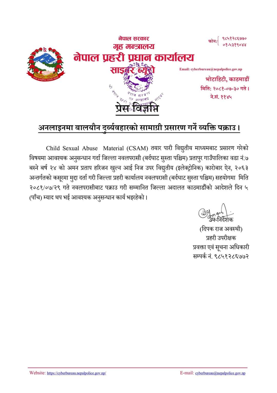 नेपाल प्रहरी प्रधान कार्यालय साइबर ब्यूरोबाट खटिएको प्रहरीले जिल्ला प्रहरी कार्यालय नवलपरासी पश्चिमको सहयोगमा उनलाई नवलपरासीबाट पक्राउ गरेको हो।