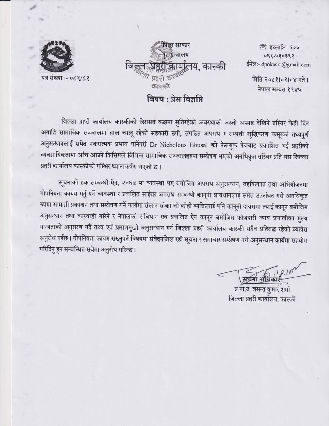 प्रहरीले फोटो सार्वजनिक गर्ने व्यक्तिलाई कारवाही गर्ने उल्लेख गरेको छ । ‘‘प्रकाशन तथा सम्प्रेषण गर्ने कार्यमा संलग्न रहेका जो कोही व्यक्तिलाई पनि कानूनी दायरामा ल्याई कानून बमोजिम अनुसन्धान तथा कारवाही गरिने र नेपालको संविधान एवं प्रचलित ऐन कानून बमोजिम फौजदारी न्याय प्रणालीका मुल्य मान्यताको अनुसरण गर्दै तथ्य एवं प्रमाणमुखी अनुसन्धान गर्न जिल्ला प्रहरी कार्यालय कास्की सदैव प्रतिवद्ध रहेको व्यहोरा अनुरोध गर्दछौं,’ विज्ञप्तीमा भनिएको छ ।