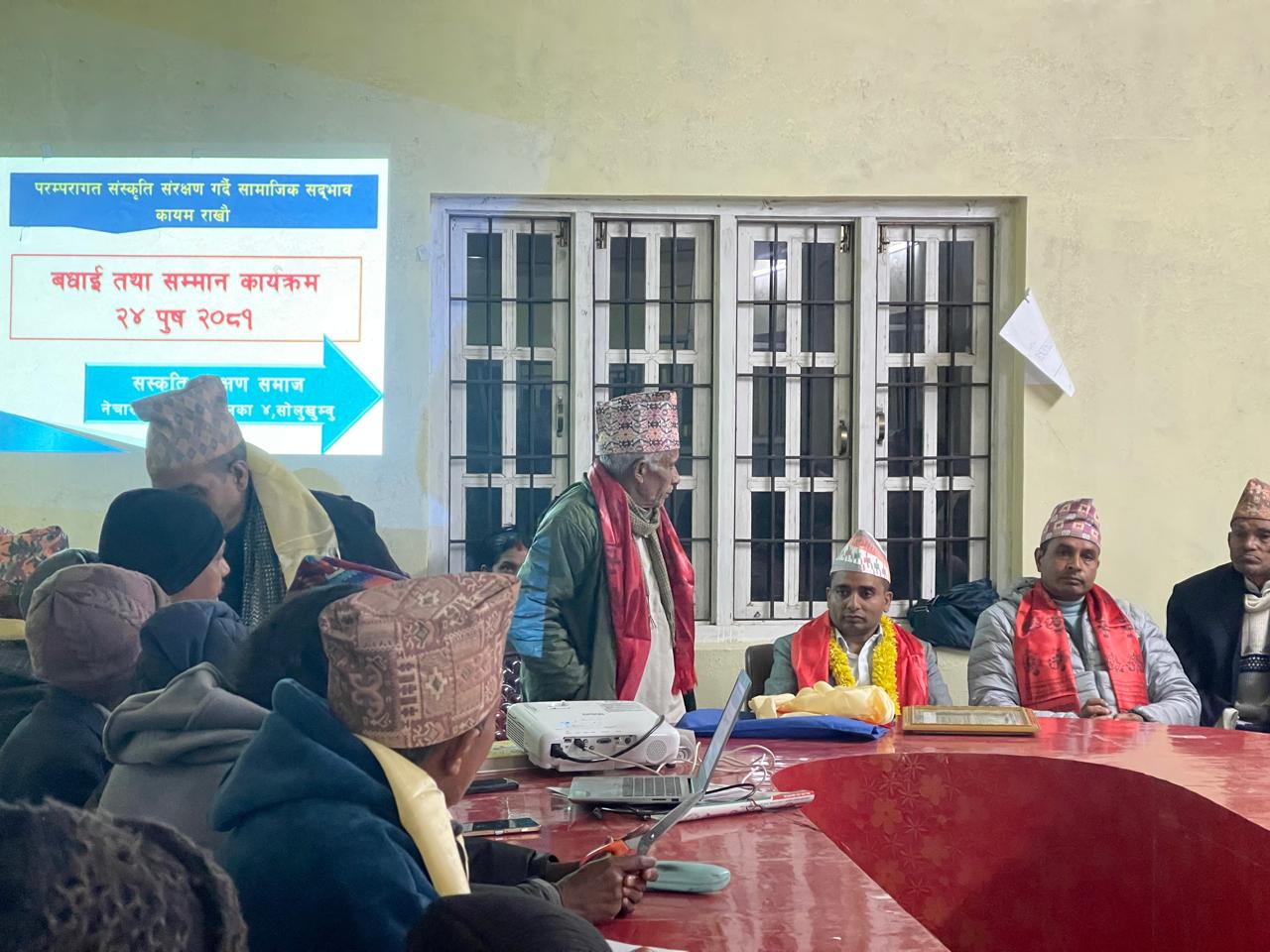 संस्कृति संरक्षण समाजद्वारा बुधबार आयोजित बधाई तथा सम्मान कार्यक्रम समाजका सल्लाहकारसमेत रहेका नेचासल्यान गाउँपालिकाका संस्थापक अध्यक्ष एबम् नेकपा एमाले सोलुखुम्बु जिल्ला कमिटी अध्यक्ष डुफकुमार बास्तोलाको प्रमुख आतिथ्यता,श्री केदार माबिमा सम्मानित ब्यक्तित्व स्वयं र बास्तोला कुल सेवा समितिमा सल्लाहकार संयोजक बेदनाथ बास्तोलाको प्रमुख आतिथ्यतामा कार्यक्रम सम्पन्न भएको थियो।