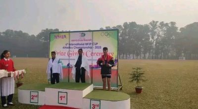 केदार बस्नेत,काठमाडौँ :यु-१८ उमेर समुहका छात्र,छात्राबीच बंगलादेशमा प्रतिस्पर्धा भैरहेको छैटौं आमन्त्रण बीकेएसपी कप एथलेटिक्स च्याम्पियनसिपमा नेपाली खेलाडीले आज बुधबार एक स्वर्ण र एक काँस्य पदक जितेका छन् ।