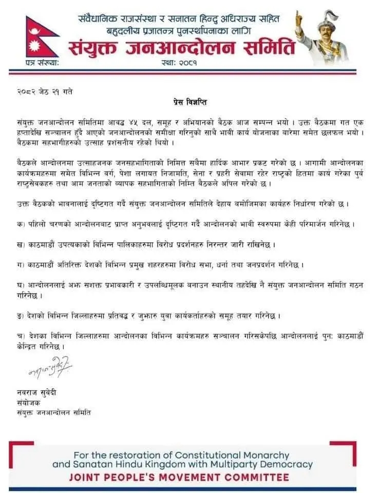 बैठकपछि संयोजक सुवेदीद्वारा जारी विज्ञप्तिमा जनाइए अनुसार आन्दोलनलाई अझ सशक्त,प्रभावकारी र उपलब्धीमूलक बनाउन स्थानीय तहदेखि नै संयुक्त जनआन्दोलन समिति गठन गरिनुका साथै काठमाडौंका अतिरिक्त देशका प्रमुख शहरहरुमा विरोधसभा, धर्ना तथा जनप्रदर्शन गर्ने गरी कार्यक्रम तय गरिएको छ ।