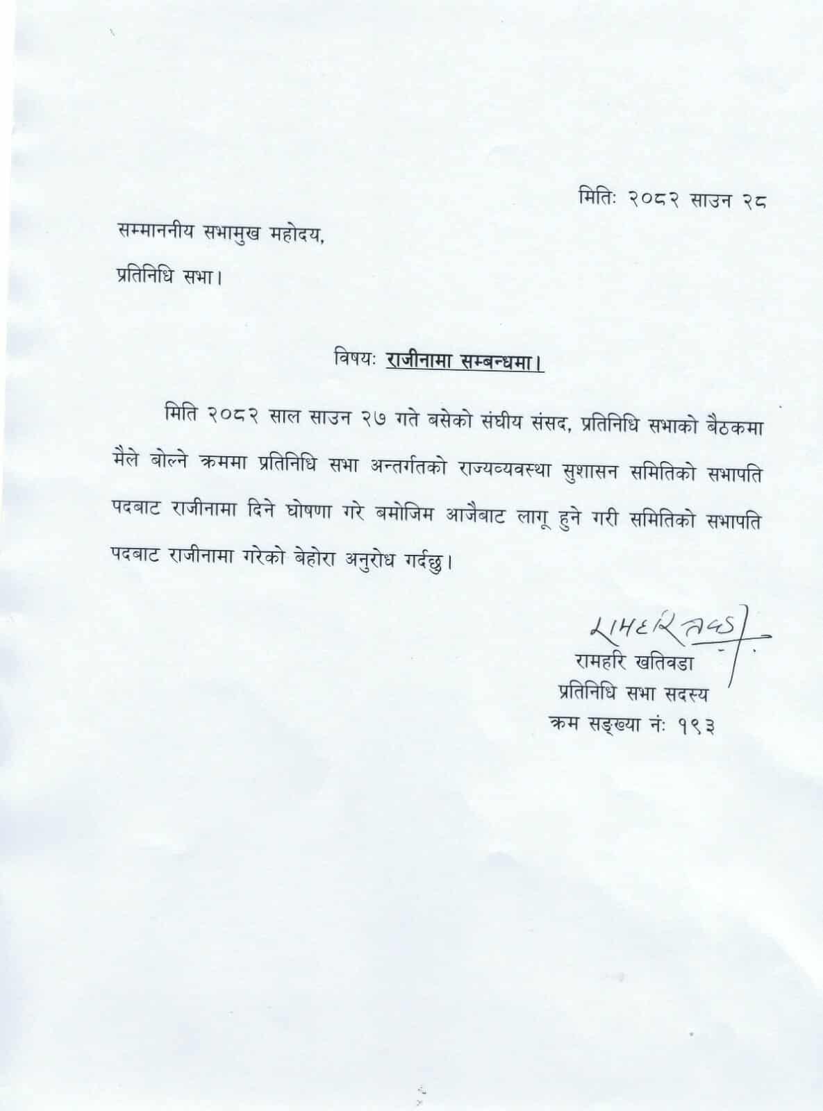 काठमाडौं,२८ साउन । नेपाली कांग्रेसका सांसद रामहरि खतिवडाले राज्य व्यवस्था तथा सुशासन समितिको सभापतिबाट औपचारिकरूपमा राजीनामा बुझाएका छन् ।