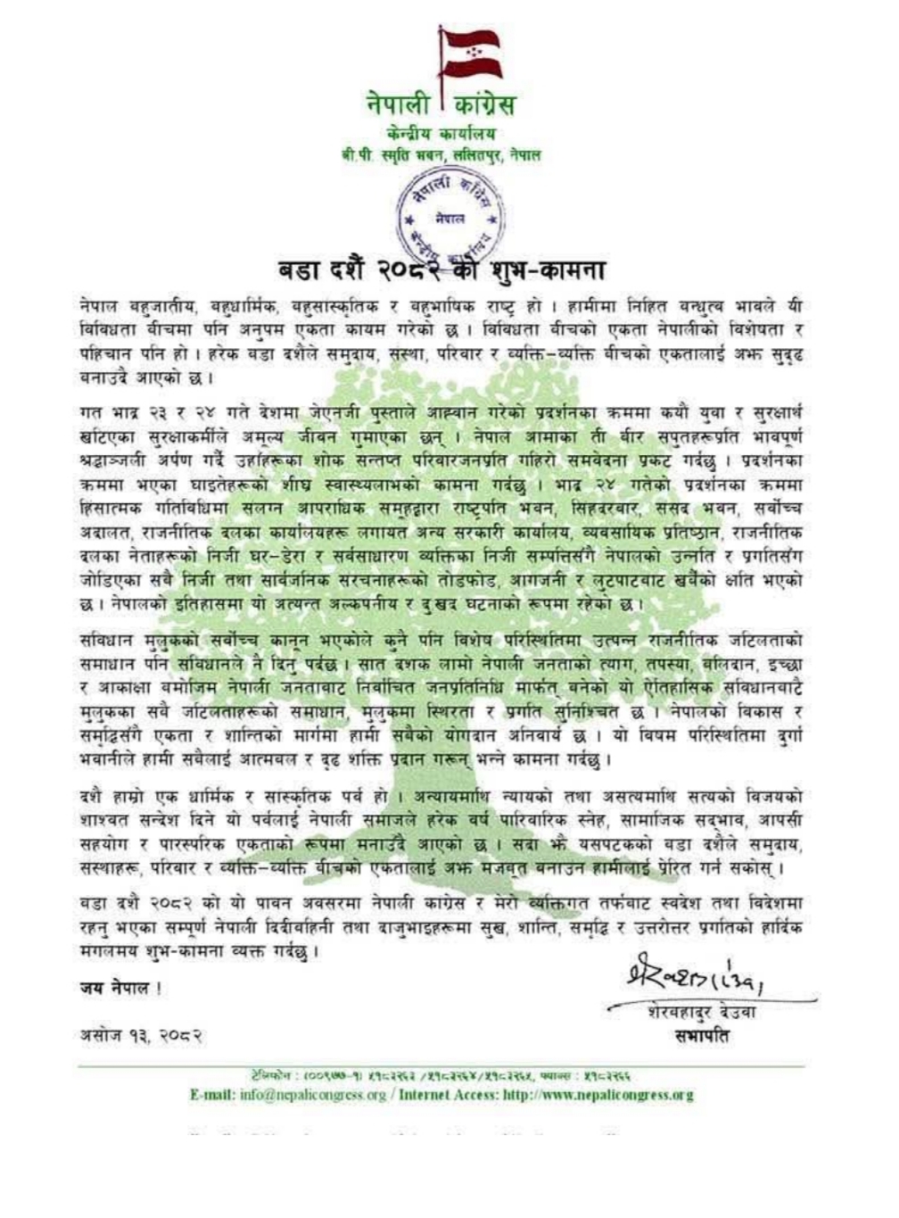 सोमबार ०८२ सालको दशैंको शुभकामना एक सन्देश जारी गर्दै पूर्वप्रधानमन्त्रीसमेत रहेका देउवाले संविधान मुलुकको सर्वोच्च कानुन भएकाले कुनै पनि विशेष परिस्थितिमा उत्पन्न राजनीतिक जटिलताको समाधान संविधानले दिनुपर्ने उनको भनाइ छ।