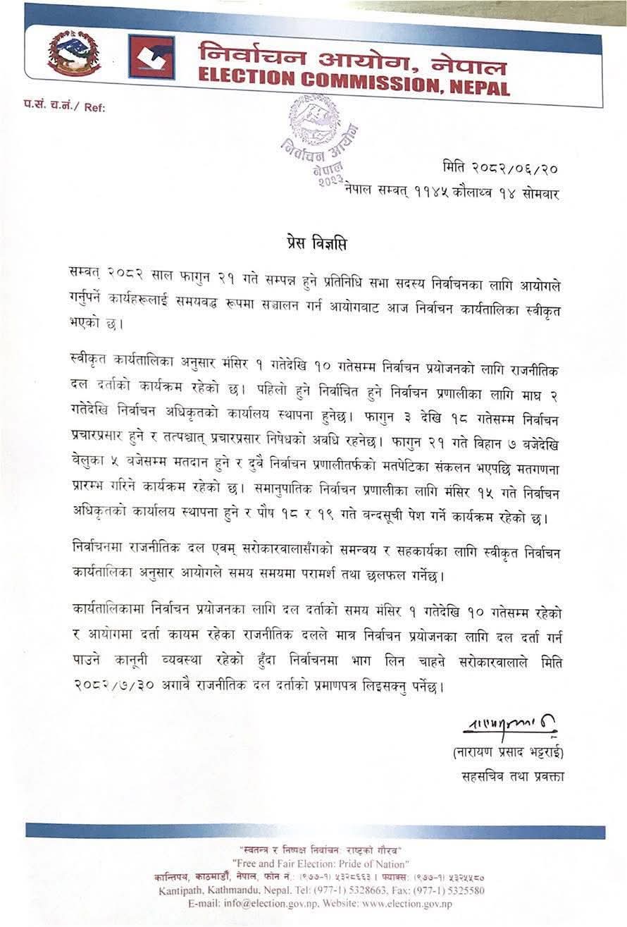 फागुन २१ मा हुने निर्बाचनको कार्यतालिका सार्बजनिक,मंसिर १ गतेदेखि १० गतेसम्म दल दर्ता गरि सक्नुपर्ने