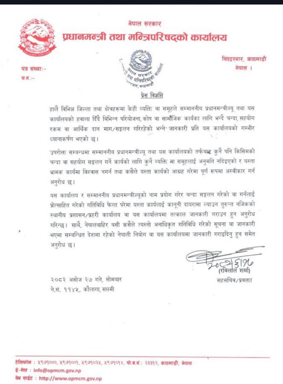 प्रधानमन्त्री तथा मन्त्रिपरिषद् कार्यालयका सहसचिव एवं प्रवक्ता रविलाल शर्माका अनुसार प्रधानमन्त्री एवं प्रधानमन्त्री कार्यालयका तर्फबाट कुनै पनि किसिमको चन्दा वा सहयोग सङ्कलन गर्ने कार्यका लागि कोही कसैलाई अनुमति दिइएको छैन ।
