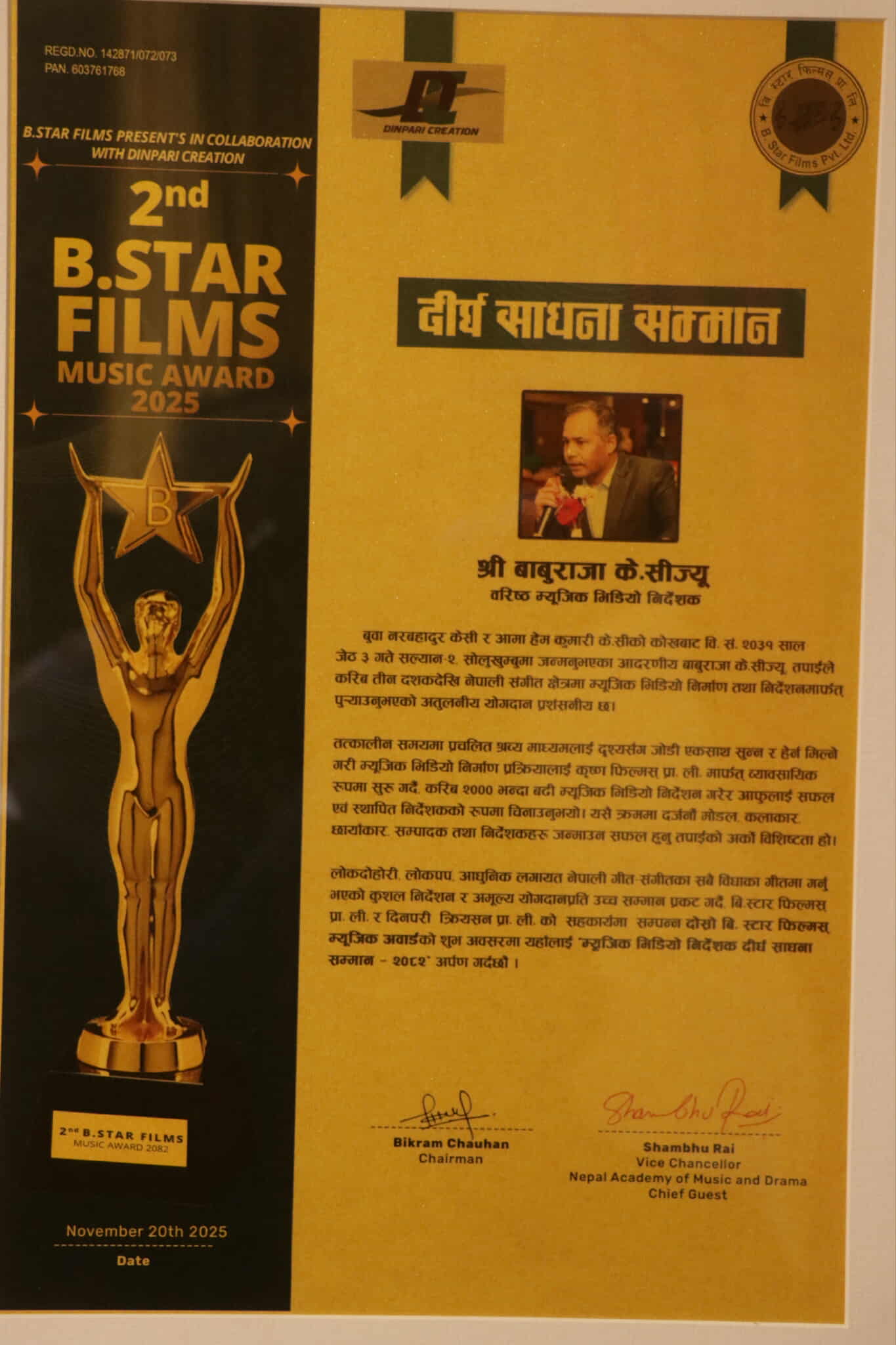 लोकदोहोरी, लोकपप, आधुनिक लगायत नेपाली गीत संगीतका सबै विधाका गीतमा गर्नु भएको कुशल निर्देशन र अमूल्य योगदानप्रति उच्च सम्मान प्रकट गर्दै बि.स्टार फिल्मस् प्रालि र दिनपरी क्रियसन प्रालि को सहकार्यमा सम्पन्न दोस्रो बि. स्टार फिल्मस् म्यूजिक अवार्डको शुभ अवसरमा यहाँलाई म्यूजिक भिडियो निर्देशक दीर्घ साधना सम्मान – २०८२ अर्पण गर्दछौं ।