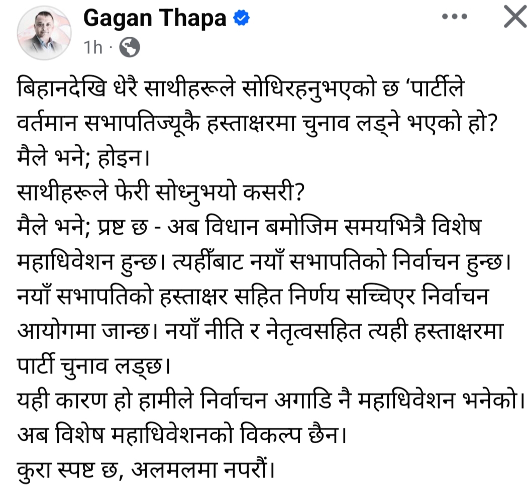 आफूलाई धेरैले ‘ पार्टीले वर्तमान सभापतिज्यूकै हस्ताक्षरमा चुनाव लड्ने भएको हो ? भनेर सोधिरहेको उल्लेख गर्दै थापाले त्यसको स्पष्ट उत्तर ‘होइन’ भएको बताए । उनका अनुसार पार्टी विधानअनुसार निर्धारित समयमा विशेष महाधिवेशन आह्वान गरी नयाँ सभापति चयन हुनेछन् ।