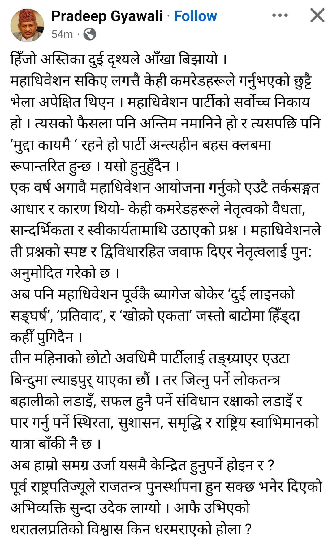 उनले लेखेका छन्– ‘पूर्व राष्ट्रपतिज्यूले राजतन्त्र पुनर्स्थापना हुन सक्छ भनेर दिएको अभिव्यक्ति सुन्दा उदेक लाग्यो । आफैँ उभिएको धरातलप्रतिको विश्वास किन धरमराएको होला ?’
