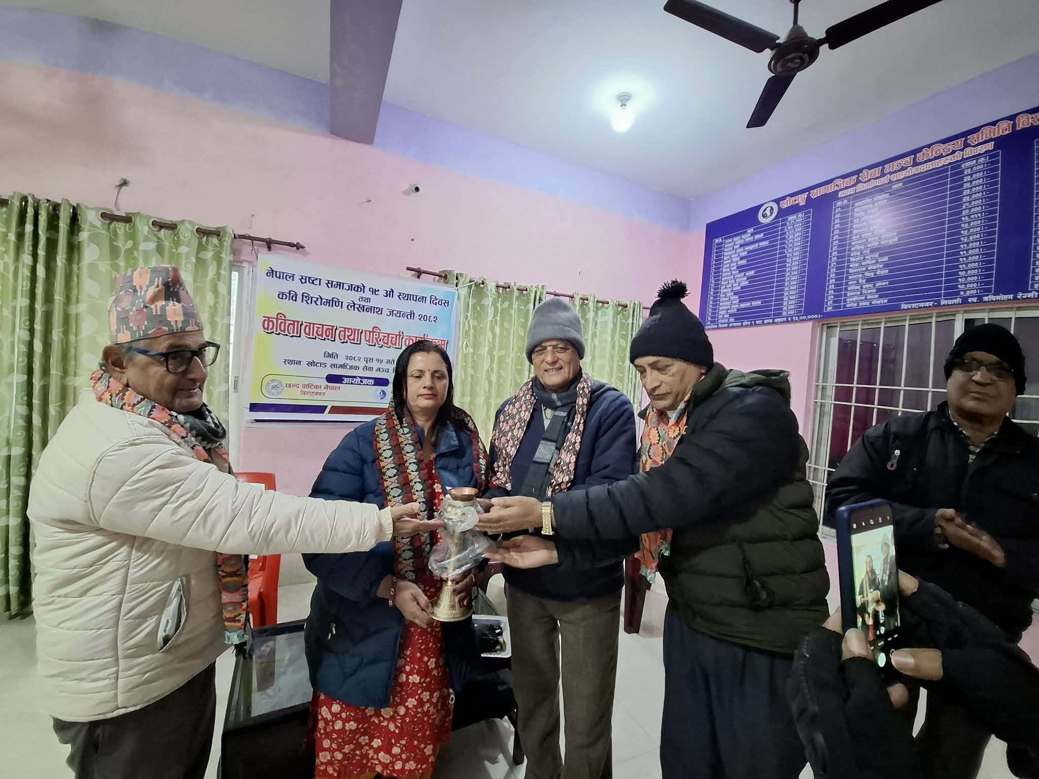 विराटनगर,१५ पौष । छन्द वाटिका नेपाल र स्रष्टा समाज कोशी प्रदेशको संयुक्त आयोजनामा कवि शिरोमणि लेखनाथ पौड्यालको जन्म जयन्ती तथा नेपाल स्रष्टा समाजको १९ औँ स्थापना दिवस मनाइएको छ ।