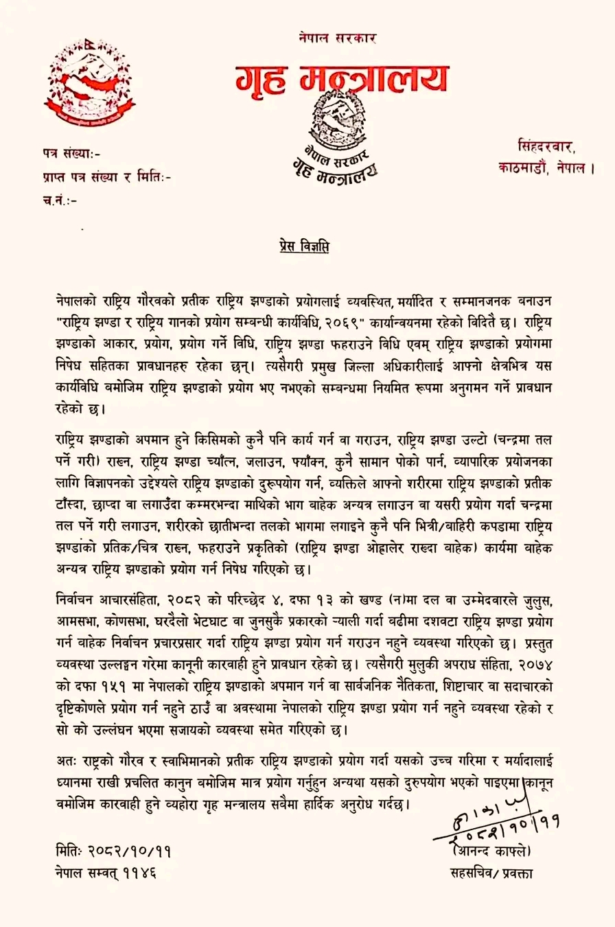 काठमाडौ,११ माघ । गृह मन्त्रालयले निर्वाचनमा राष्ट्रिय झण्डाको अपमान हुने किसिमको कार्य गरे कारबाही गर्ने चेतावनी दिएको छ। ‘राष्ट्रिय झण्डा र राष्ट्रिय गानको प्रयोग सम्बन्धी कार्यविधि, २०६९’ अनुसार मात्रै प्रयोग गर्न अनुरोध मन्त्रालयका प्रवक्ता आनन्द काफ्लेले आइतबार विज्ञप्ति जारी गर्दै दुरुपयोग गरिए कारबाही गर्ने चेतावनी दिएका हुन्।
