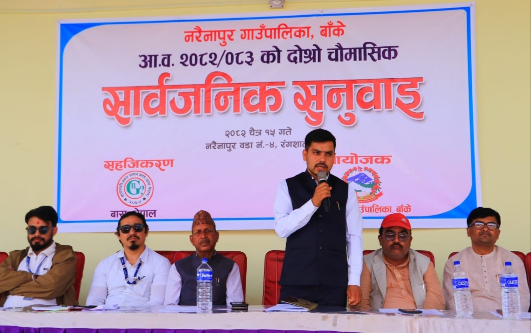 नेपालगन्ज,१६ चैत । नरैनापुर गाउँपालिका बाँकेको चालु आ.ब. २०८२/०८३ को दोश्रो चौमासिक सार्वजनिक सुनुवाई बास नेपालको सहजिकरणमा सम्पन्न भएको छ ।