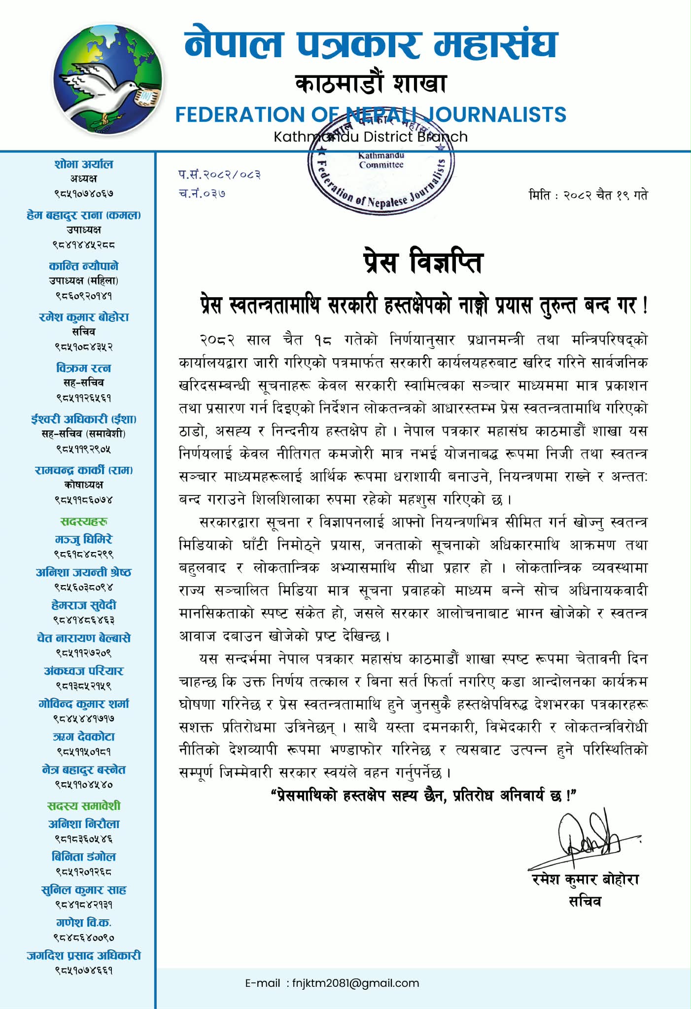 काठमाडौं शाखाले उक्त निर्णयलाई ‘ठाडो, असह्य र निन्दनीय हस्तक्षेप’ को संज्ञा दिँदै यसले निजी सञ्चार माध्यमको आर्थिक आधार कमजोर पार्ने मात्र नभई दीर्घकालीन रूपमा तिनको अस्तित्वनै संकटमा पर्ने भन्दै चिन्ता व्यक्त गरेको छ । शाखाका सचिव रमेश कुमार बोहोराले प्रेस विज्ञाप्ति प्रकाशित गर्दै सरकारी सूचना र विज्ञापन निजी मिडियाका लागि प्रमुख आम्दानीको स्रोत भएको अवस्थामा यसलाई सीमित गर्नु योजनाबद्ध रूपमा स्वतन्त्र मिडियालाई नियन्त्रणमा राख्ने रणनीति भएको समेत विज्ञाप्तिमा उल्लेख गरेको छ ।