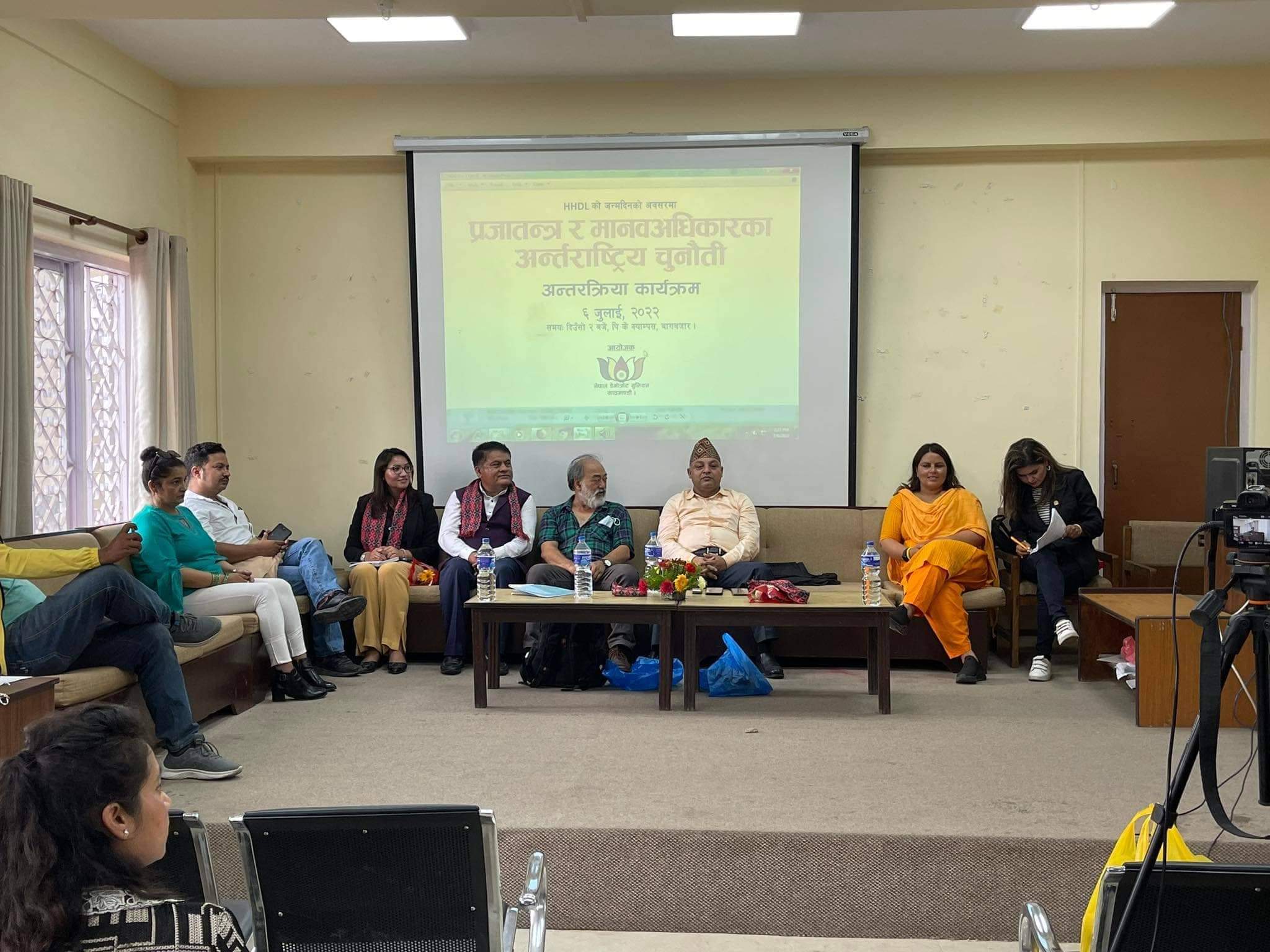 काठमाडौँ।राजधानीमा आयोजित एक अन्तरक्रियाका बक्ताहरुले विश्वभर गरिबी,आतङ्क र साम्यवादका कारण मानवअधिकारमा ठूलो चुनौती थपिदैं गएको भन्दै चिन्ता व्यक्त गरेका छन्। काठमाडौँको बागबजारस्थित पिके क्याम्पसमा आयोजित ‘प्रजातन्त्र र मानवअधिकारका अन्तरराष्ट्रिय चुनौती