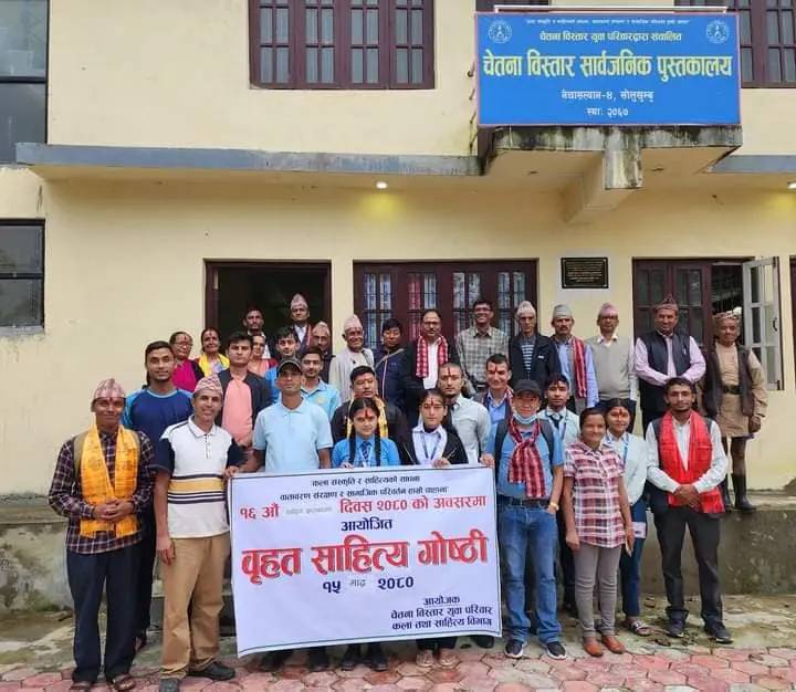 डिल्ली शर्मा,साेलुखुम्बु।चेतना बिस्तार सार्बजनिक पुस्तकालय नेचासल्यानकाे आयाेजनामा बृहत् साहित्यिक गाेष्ठी तथा माध्यमिक विद्यालयस्तरीय कबिता प्रतियाेगिता सम्पन्न भएकाे छ। १६ औं राष्ट्रिय पुस्तकालय दिबसकाे अबसरमा अाज साे कार्यक्रमकाे आयाेजना गरिएकाे हाे।चेतना