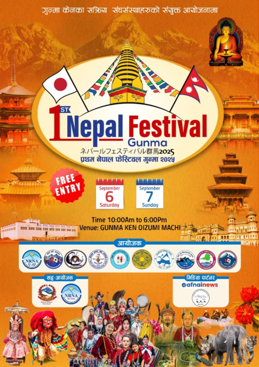 दावा जाङ्बु शेर्पा,काठमाडौं,८ साउन । गुन्मा केनका १० वटा नेपाली संघ–संस्थाहरूको संयुक्त आयोजनामा “प्रथम नेपाल फेस्टिवल गुन्मा २०२५” भव्य रूपमा आयोजना गरिने भएको छ। जापानमा रहेका नेपालीबीच एकता,सहकार्य र सांस्कृतिक
