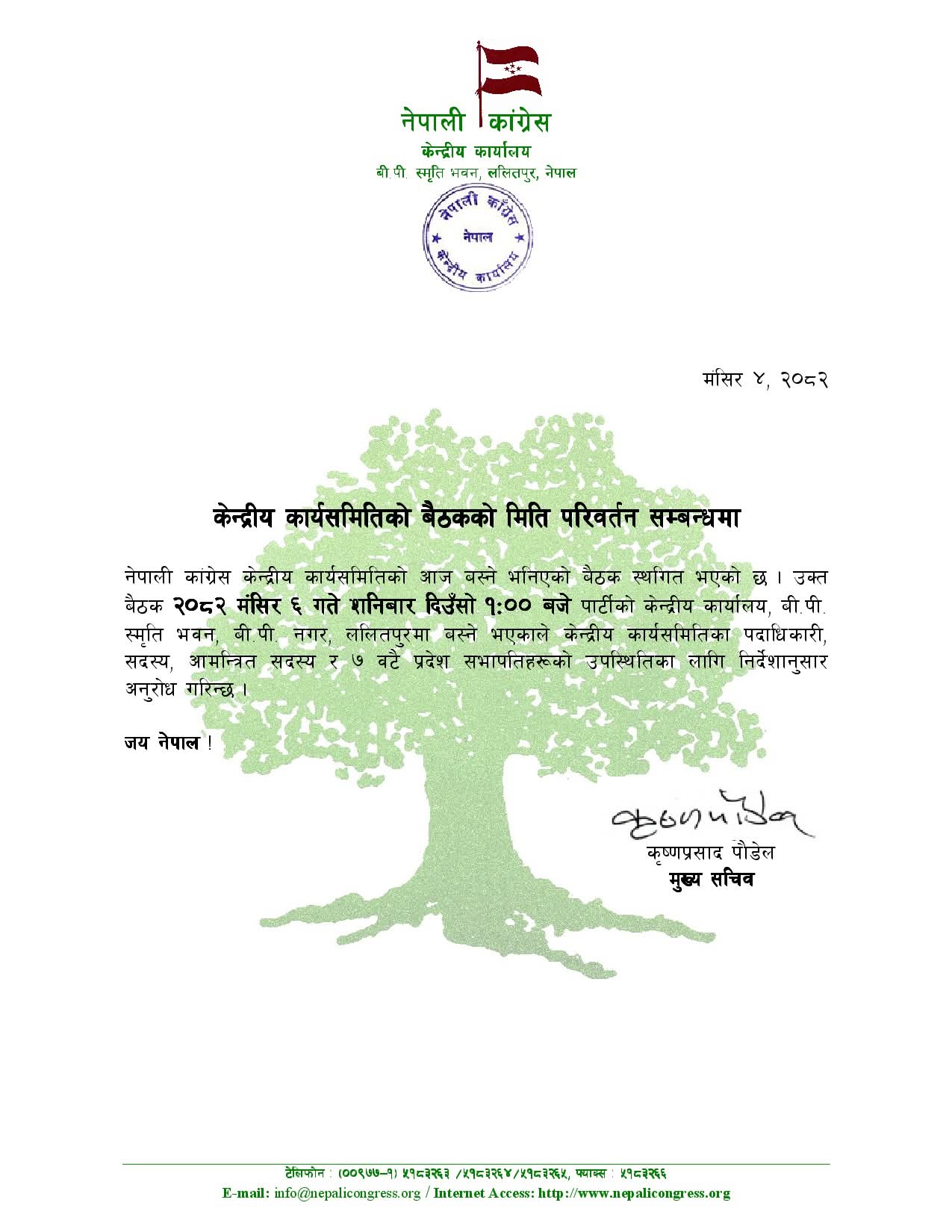 काठमाडौ,४ मंसिर । नेपाली कांग्रेस केन्द्रिय समितिको आज बस्ने भनिएको बैठक स्थगित भएको छ।अर्को बैठक मंसिर ६ गते शनिबार बस्ने गरि आजको बैठक स्थगित गरिएको नेपाली कांग्रेसका कृष्ण प्रसाद पौडेलले