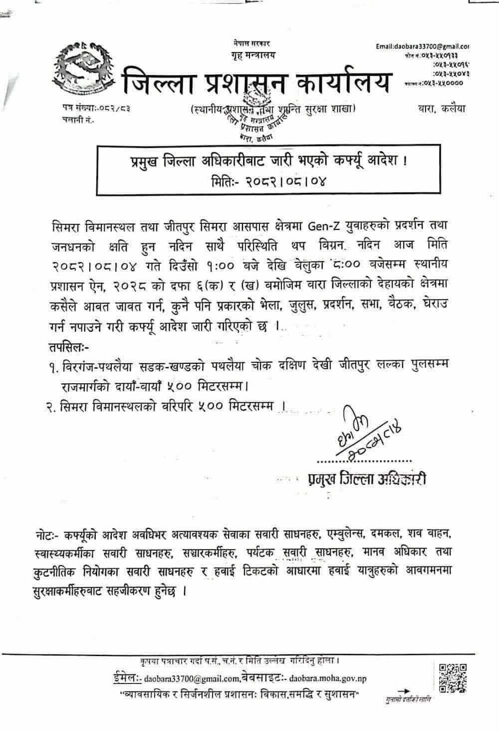काठमाडौं,४ साउन । जिल्ला प्रशासन कार्यालय बाराले सिमरा विमानस्थल तथा जीतपुर सिमरा आसपास क्षेत्रमा पुनः कर्फ्यु आदेश जारी गरेको छ । कार्यालयले आज दिउँसो १ बजेदेखि बेलुका ८ बजेसम्म कर्फ्यु